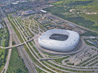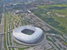 Die Allianz Arena dominiert die untere Bildhälfte. Auf der linken Bildseite führt die A9 in Richtung Tatzelwurm (Hochbrücke München-Freimann) [Interner Link]. Die Aufnahme der Südhälfte der Fröttmaninger Heide [Interner Link] überwiegt den rechten Bildrand.