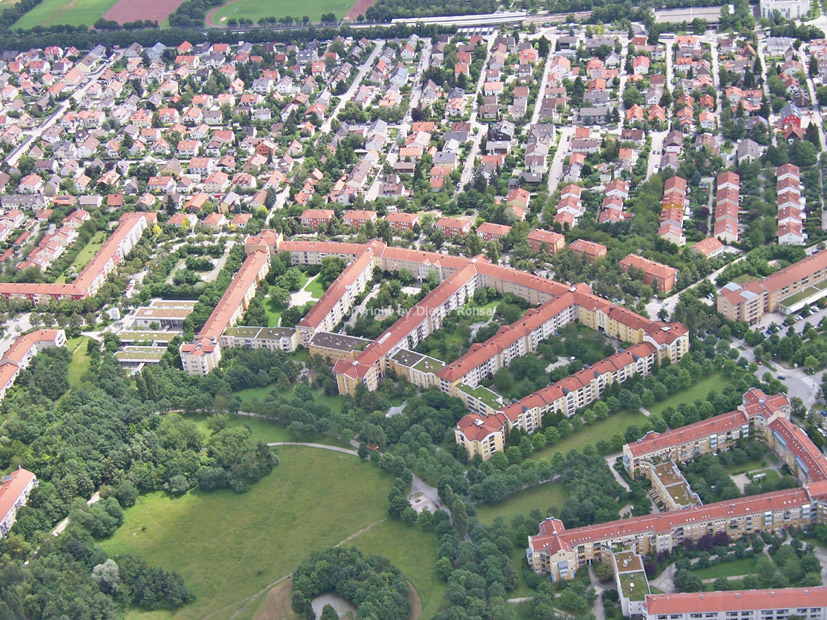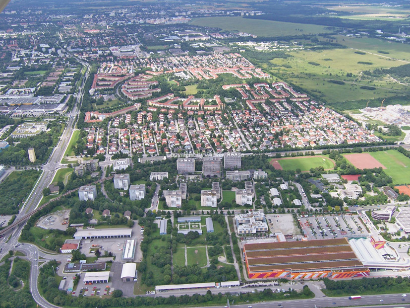 Zwischen der Autobahntrasse der A9 am unteren Bildrand und der Schleißheimer Straße am oberen Rand sind vor allem zu erkennen die