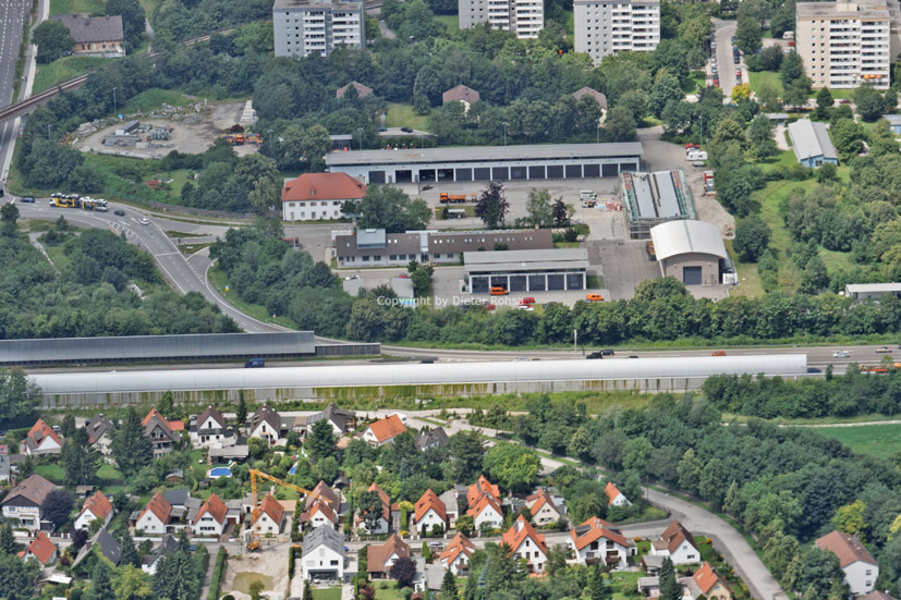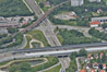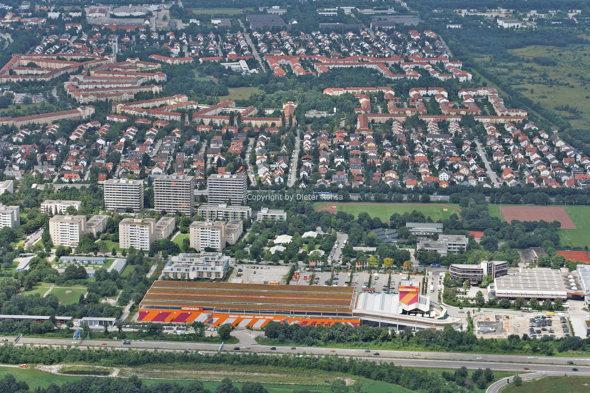 Die Autobahn A9 in der Bildmitte, darunter der Westteil der Reichskleinsiedlung Freimann, darüber die Autobahnmeisterei München-Freimann.