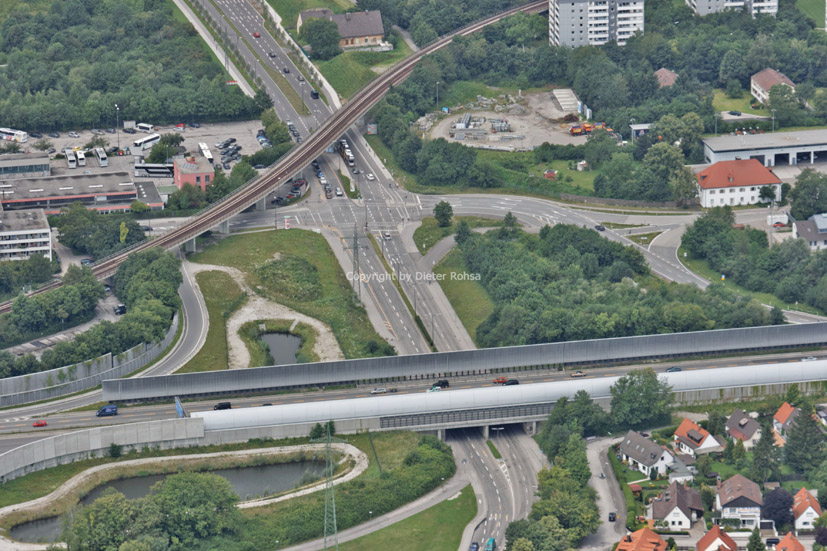 Die Autobahn A9 und die U-Bahntrasse der Linie 6 überqueren die Heidemannstraße.