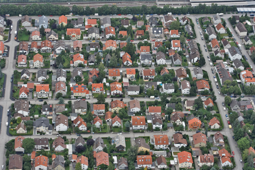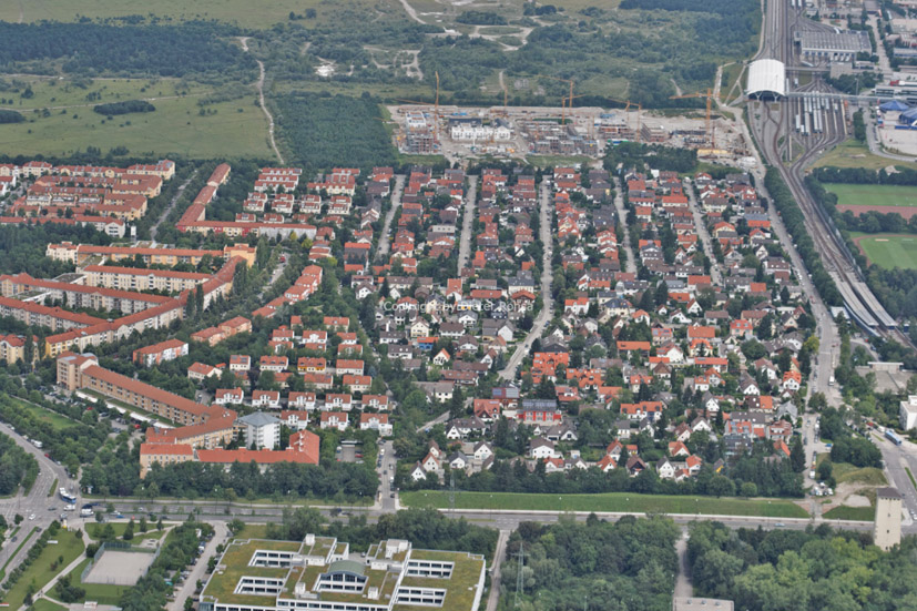 Zwischen der Autobahn A9 am unteren und der Grusonsiedlung [Interner Link] am oberen Bildrand die Postsiedlung und Freimann Nord, die Kieferngartensiedlung und die Freimanner Heide [Interner Link].