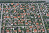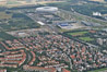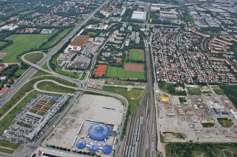 Blick über die Kieferngartensiedlung zur Allianz Arena, dazwischen Am Kiefernwald [Interner Link], der U-Bahnhof Fröttmaning [Interner Link] und die neuen Faultürme [Interner Link] vor dem Fröttmaninger Berg [Interner Link].